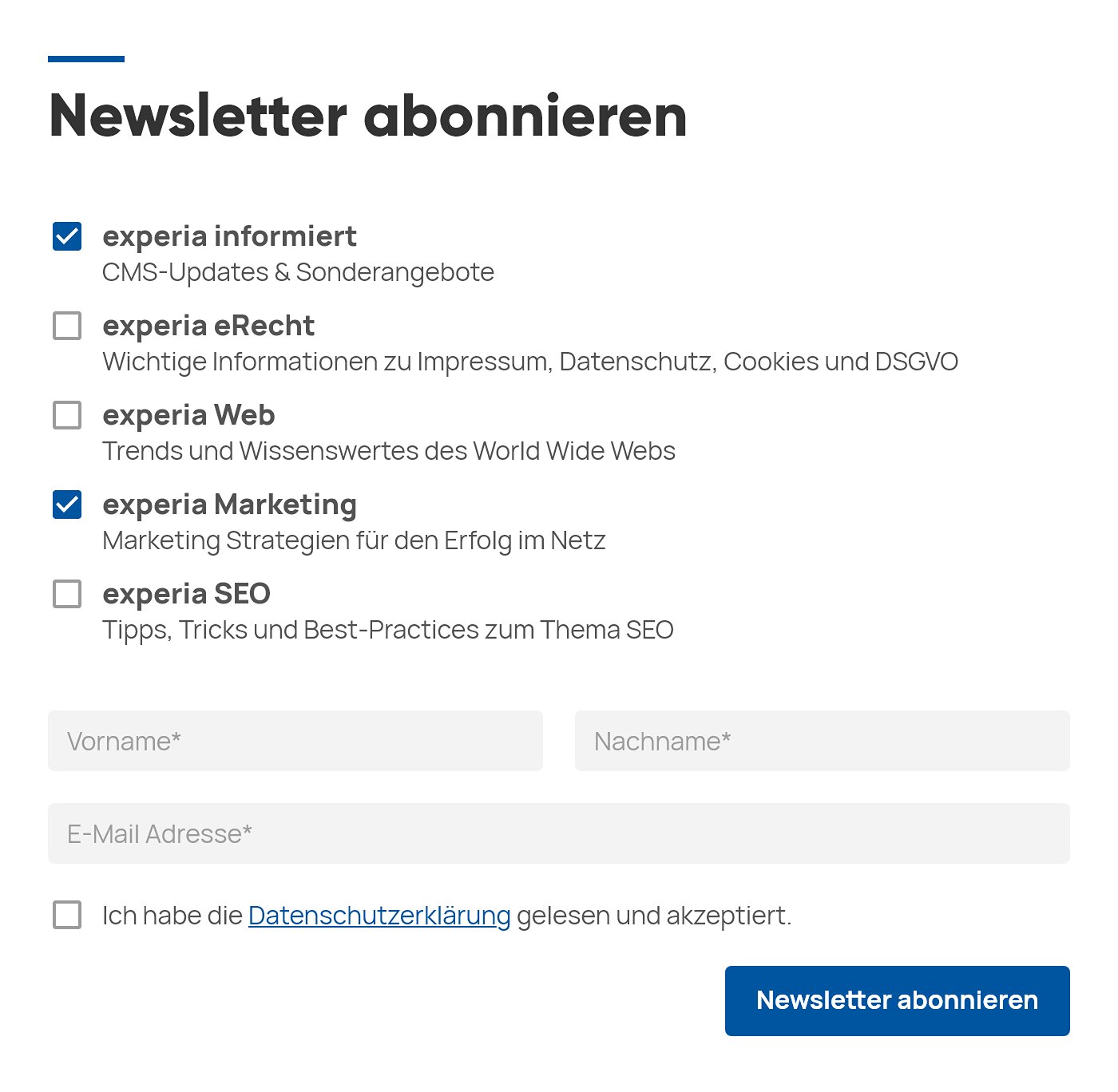 Der experia-Newsletter ist DSGVO-konform: Der Kunde meldet sich über ein Formular in wenigen simplen und transparenten Schritten an. Bereits hier werden Ihre Kunden kategorisiert.